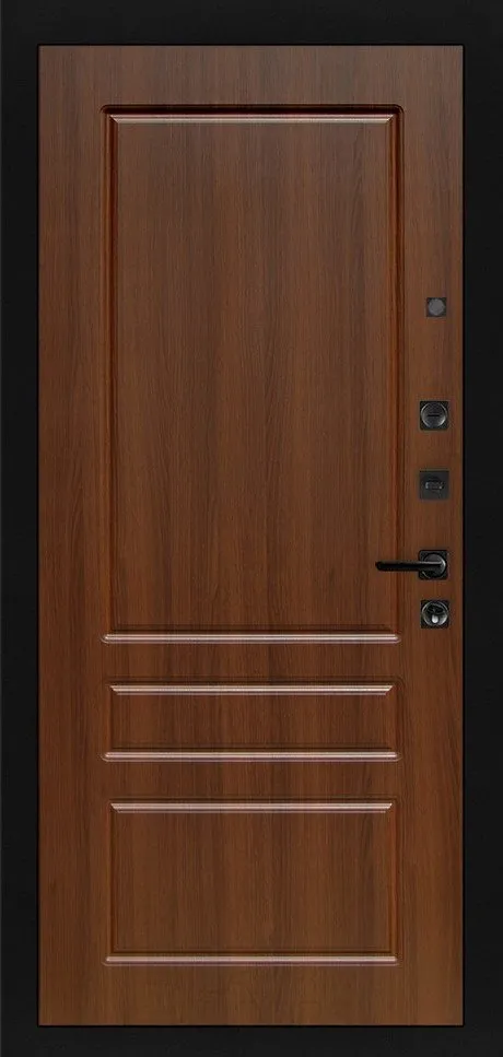 Фурнитура в черном цвете: Броненакладка врезная, накладка со шторкой, глазок , дверная ручка, ночная задвижка. Цилиндр ключ-вертушка Apecs, регулируемый эксцентрик.